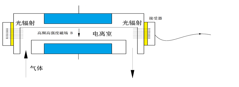 当气体通过高频高强度电磁场时,气体被击穿放电。放电产生大量电子和离子,在电场作用下,电子从电场中获取能量,通过和周围原子分子碰撞,产生能量传递,使之激发电离产生电子雪崩。雪崩中部分高能电子通过导电通道时,一些激发态原子分子会自发辐射。我们通过这些辐射来获得信号。